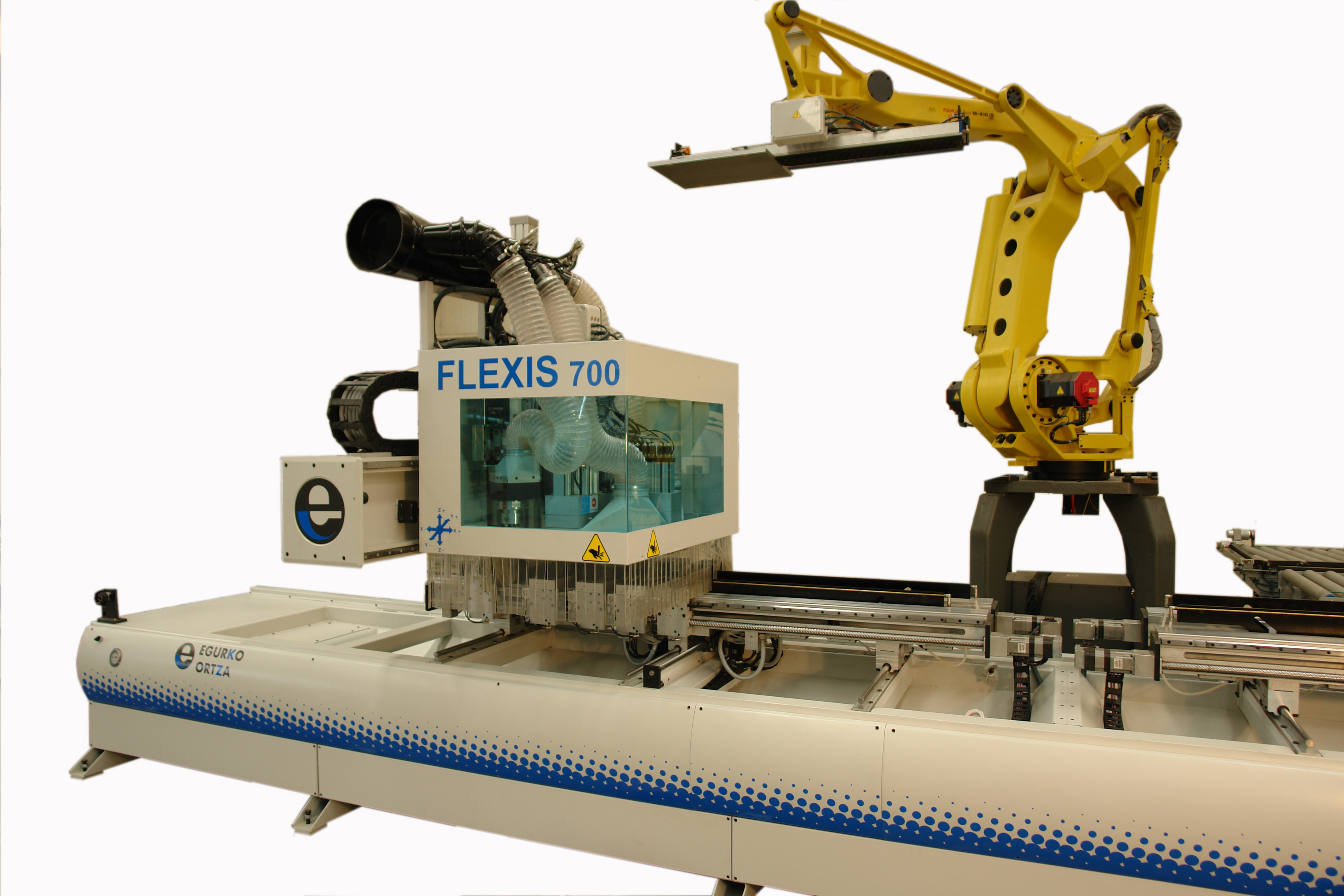 Máquina para la mecanización de piezas para el mueble (puerta, cocina,etc) con sistema de carga en automático mediante robot.